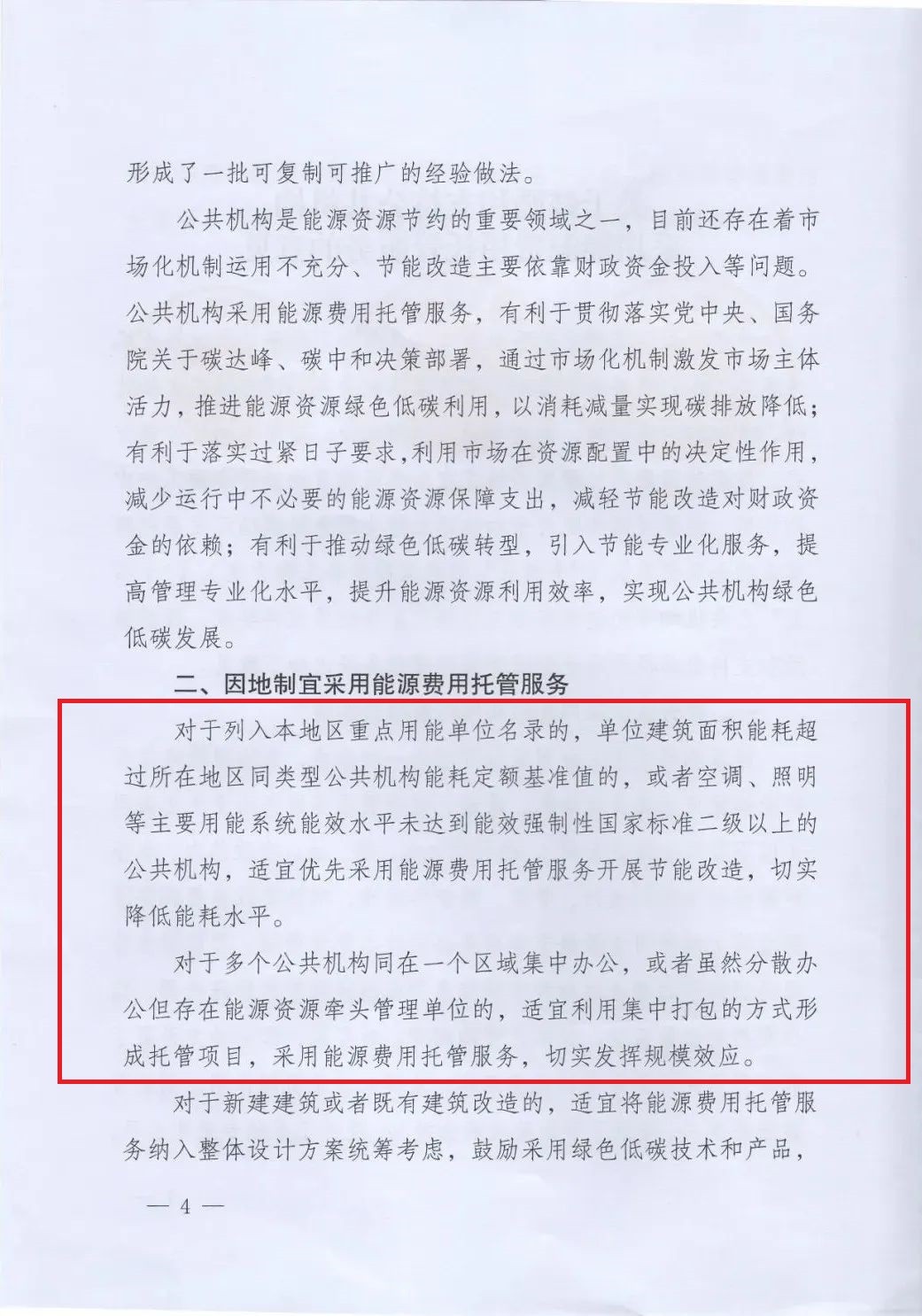 。針對集中辦公或有牽頭管理單位的公共機構(gòu),明確利用集中打包形式采用能源費用托管服務。還要求新建、改造建筑時,在設(shè)計方案階段統(tǒng)籌考慮能源費用托管服務,從源頭上把控。